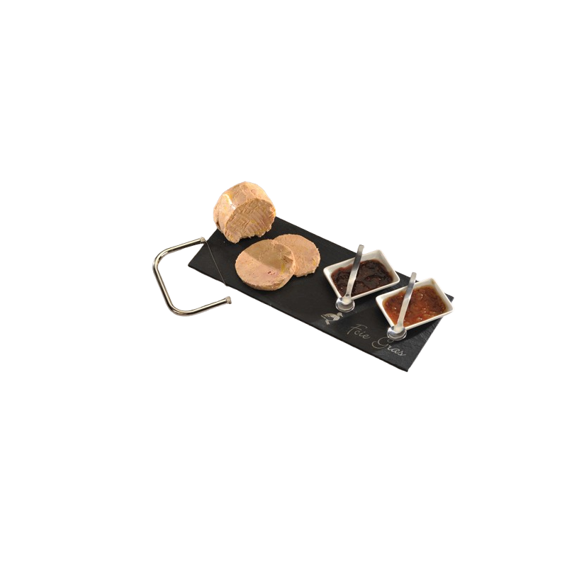 Coffret service à foie gras 6 pièces: 1 ardoise gravée au laser 30X12cm, 1 lyre à foie gras, 2 porcelaines Prodesign ovales, 2 cuillères mise en bouche Esméralda