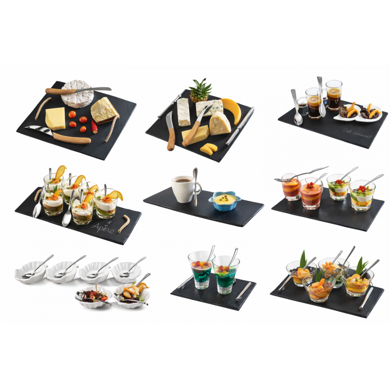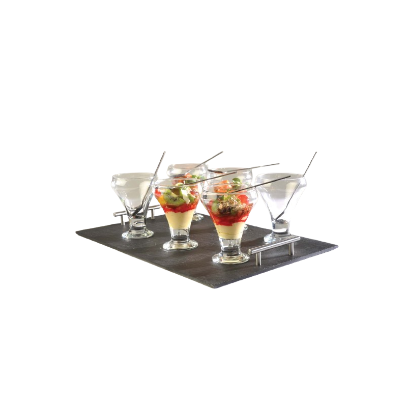 Service entrée dessert 13 pièces Hawai Corde : plateau ardoise 35x25cm poignées corde, 6 coupes Hawai, 6 pelles à glace GM
