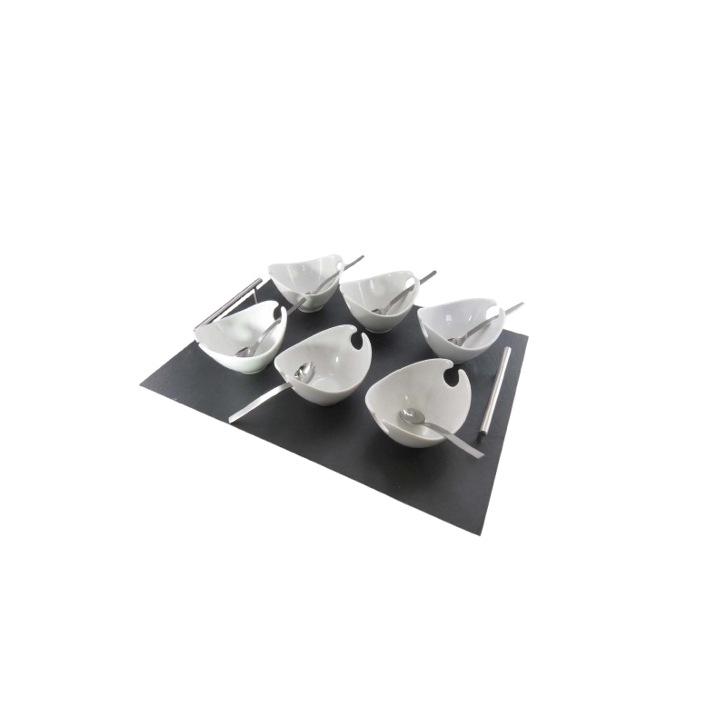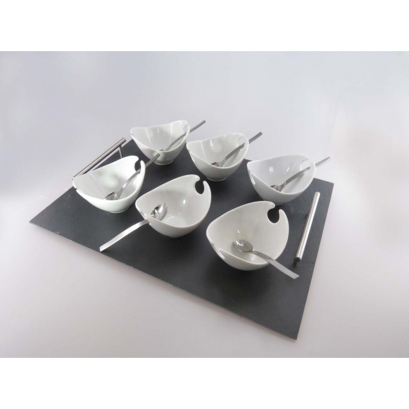Plateau coupelles Jonque blanches 9 pièces : plateau ardoise 30x30cm poignées métal, 3 coupelles jonque blanches, 3 fourchettes mixtes