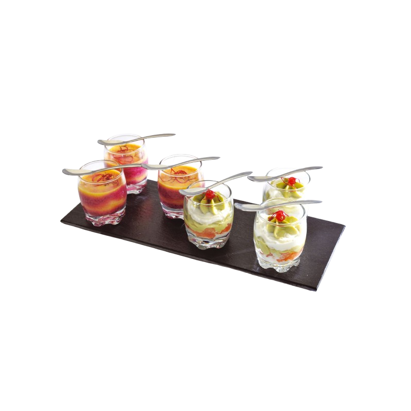Coffret verrines dégustations 13 pièces : 1 ardoise 30x12cm, 6 verrines à dégustation, 6 cuillères à Moka dégustation PM