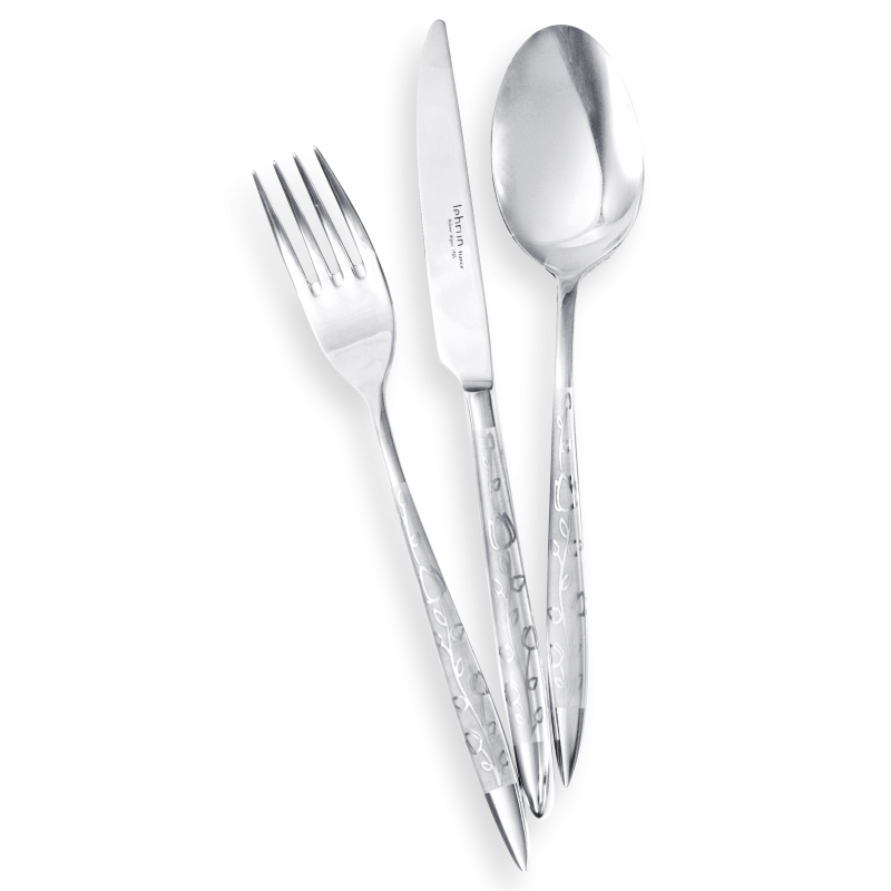18/10 stainless steel - finition contrastée- laser engraving. Ménagère complète 6 personnes - tous couverts.