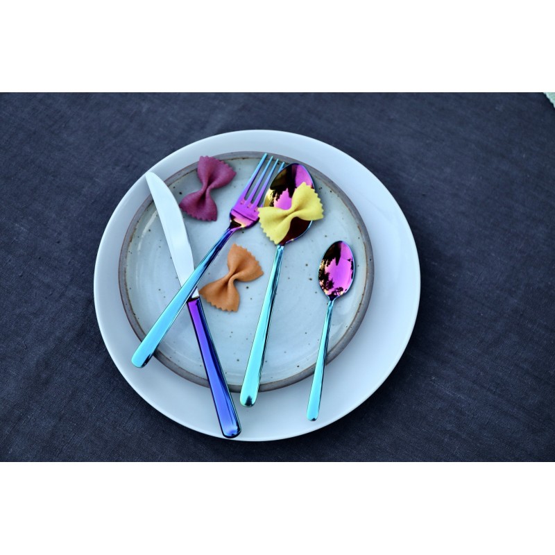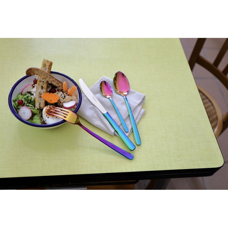 Fourchette Table 4 mm en Inox Titanium (PVD) – collection ARC EN CIEL – avec finition miroir. Cet ensemble de couverts contemporain habillera votre table élégamment en lui apportant une touche chic, design et originale. De plus, sa finition miroir donne un éclat particulier aux couleurs qui ne laisse pas indifférent. Lavage à la main conseillé. Lavage à la main conseillé.